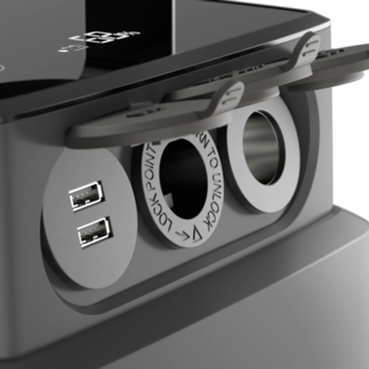 - Three-way charging via 12 V DC socket, solar panel or AC home power