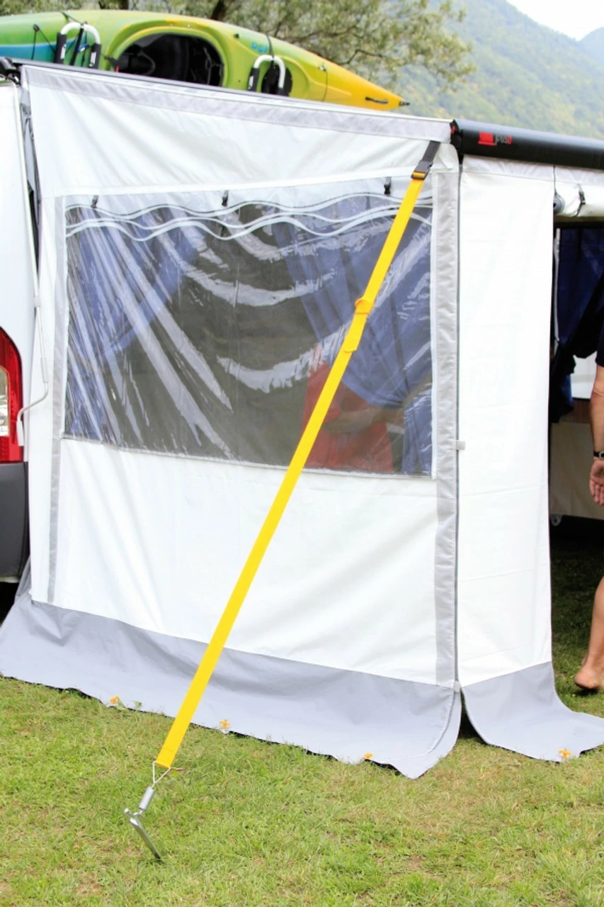 The Fiamma Tie Down Kit S is designed to hold down your awning to the ground. The Tie Down Straps attaches to the awning guide or the side clip of a privacy room. The ‘S’ kit has two straps as apposed to the ‘Plus’ which is a single strap. Available in Black or Yellow.