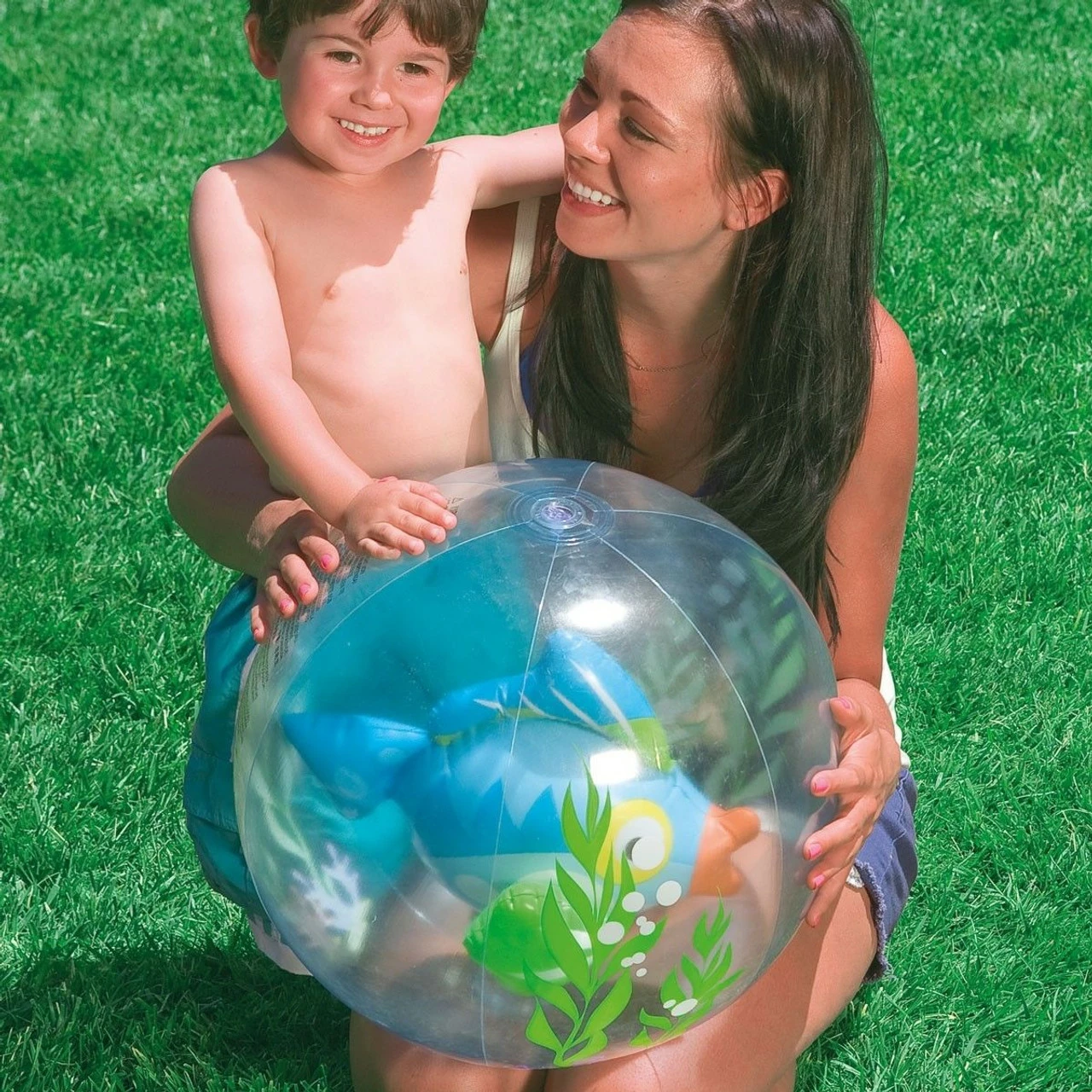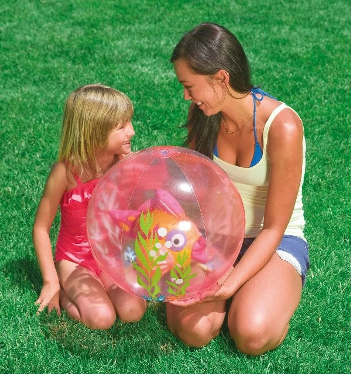 It’s a fishy beach ball in either pink or blue, complete with fish inside. 24″ diameter